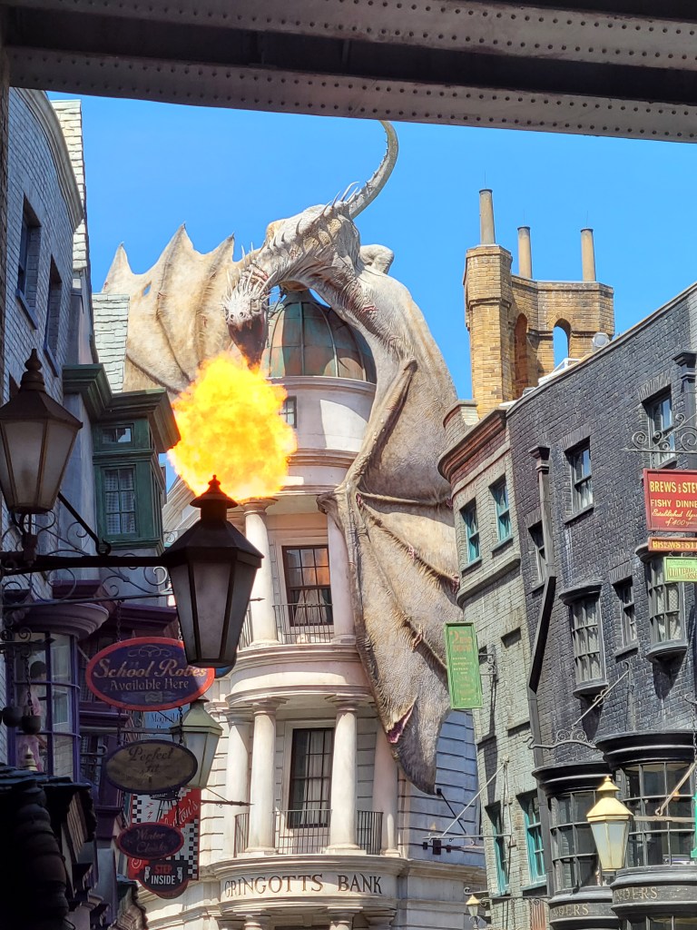 Once you are ready to head into the Wizarding World, all you have to do is find the brick wall and tap the bricks “2 up and 3 across,” 3 times (or walk around through the opening) and you will find yourself in Diagon Alley. Whether it is your first time or your hundredth time, stop and take in the magic, I promise you won’t be alone. As you are admiring the scene in Diagon Alley, you may also be greeted with a breath of fire from the dragon on top of Gringotts Bank. If you miss the fire-breathing dragon now, you can catch it some other time while you are exploring Diagon Alley, since she breathes fire about every 10 minutes. When you are done admiring the scene, you can start making your way to Gringotts Bank to get your Galleons before school shopping.