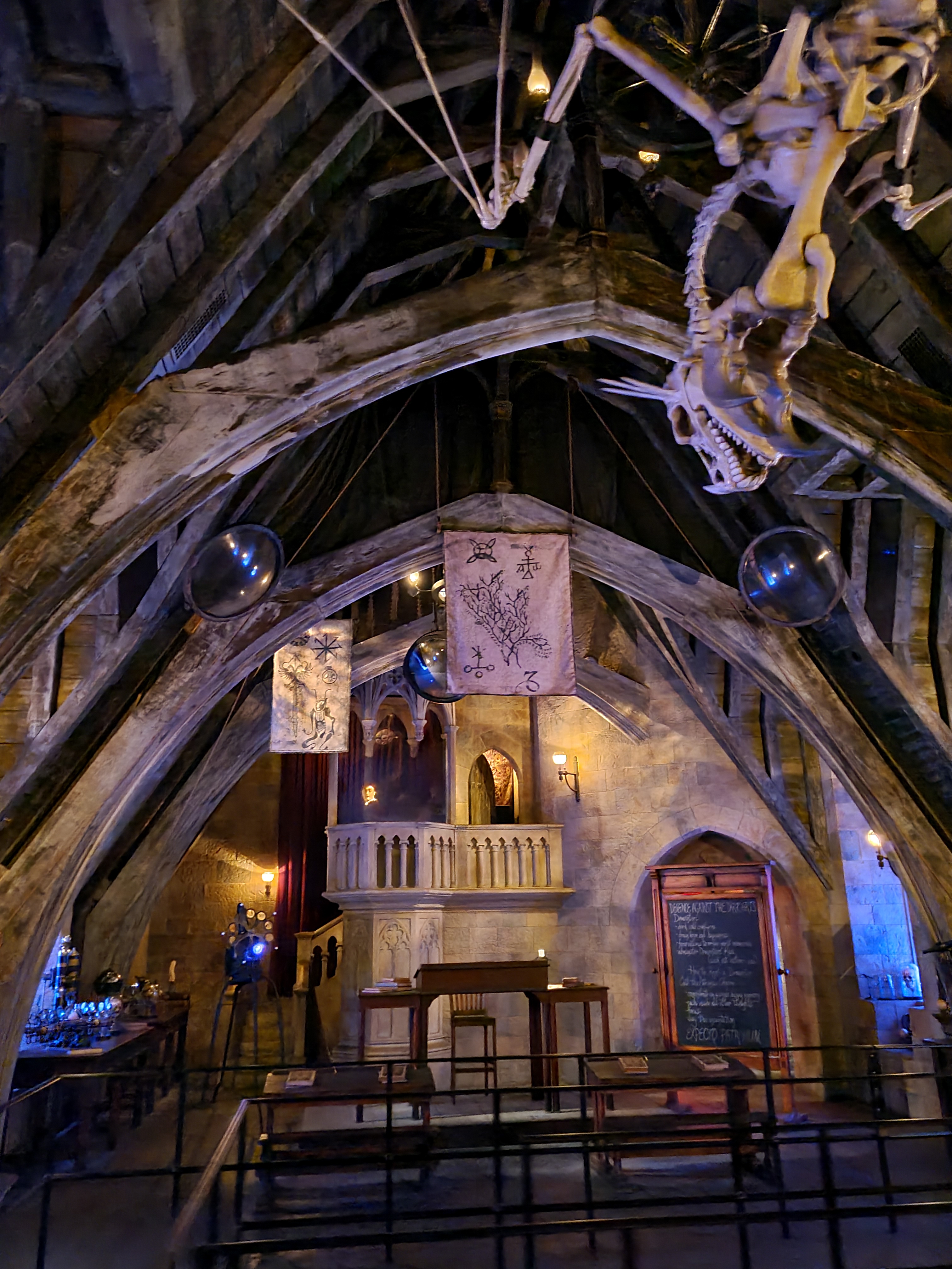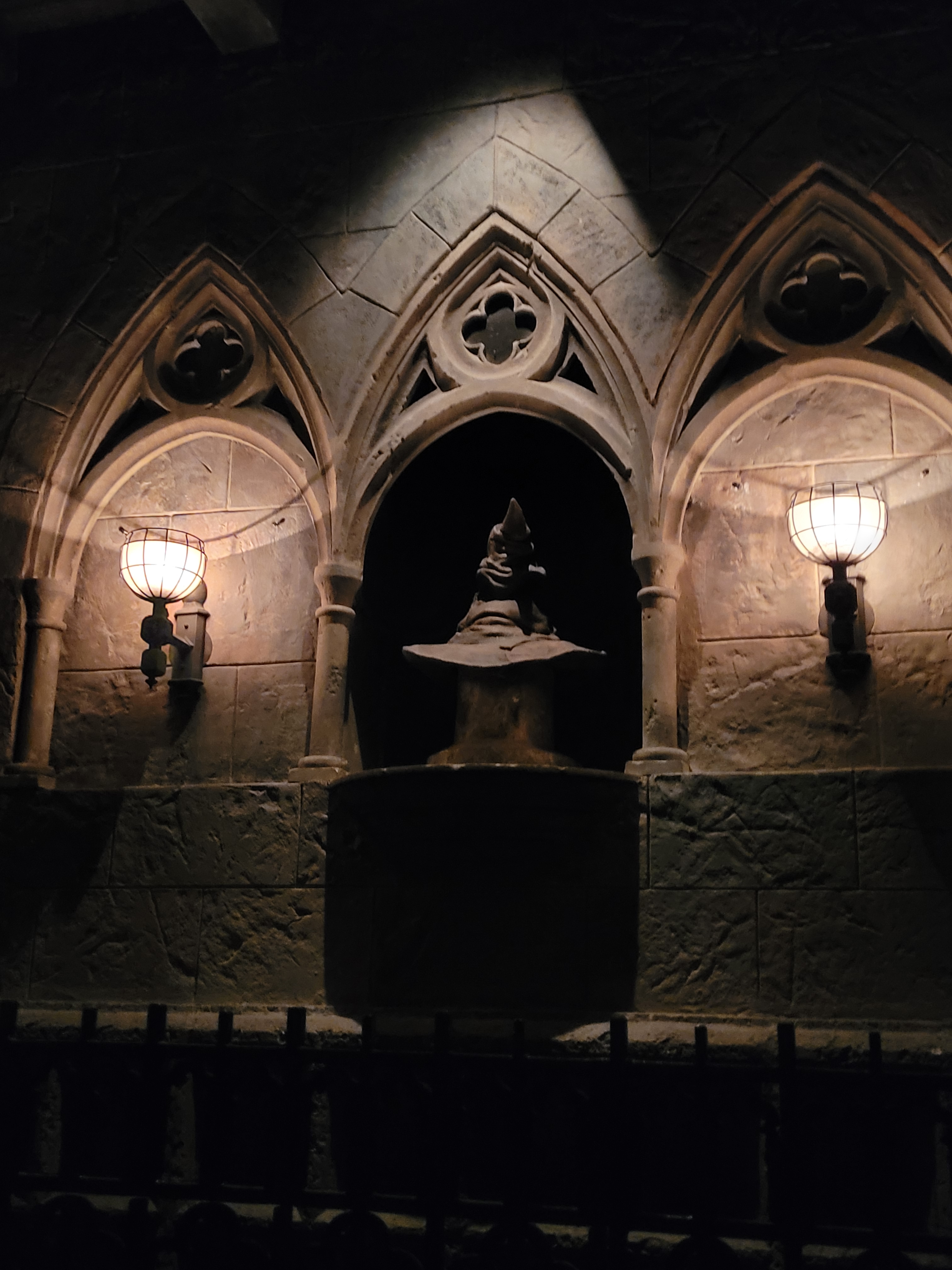 Before you can enter Hogwarts, you must drop off any bags and souvenirs you may have bought already at the lockers to the side of Hogwarts. As you make your way to Hogwarts, take a moment to appreciate the winged boars on either side of the entrance and all of the details in the corridors as you walk through the castle. One of the first “rooms” you will see is the outside of the greenhouses, with overgrown plants creeping up the walls and across window panes. Going deeper into the castle you will see many familiar artifacts, including the griffon-blocked staircase, the sorting hat, and the Fat Lady who is sad she can’t make it to the Quidditch match.