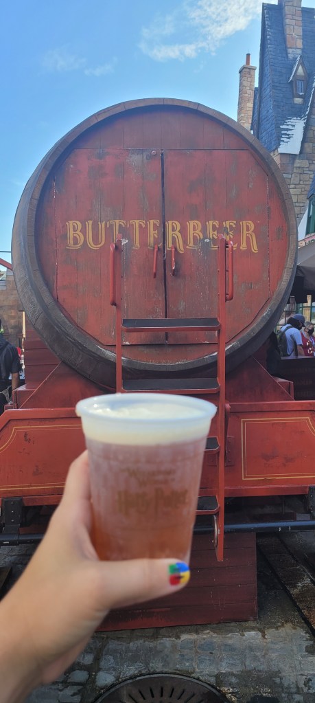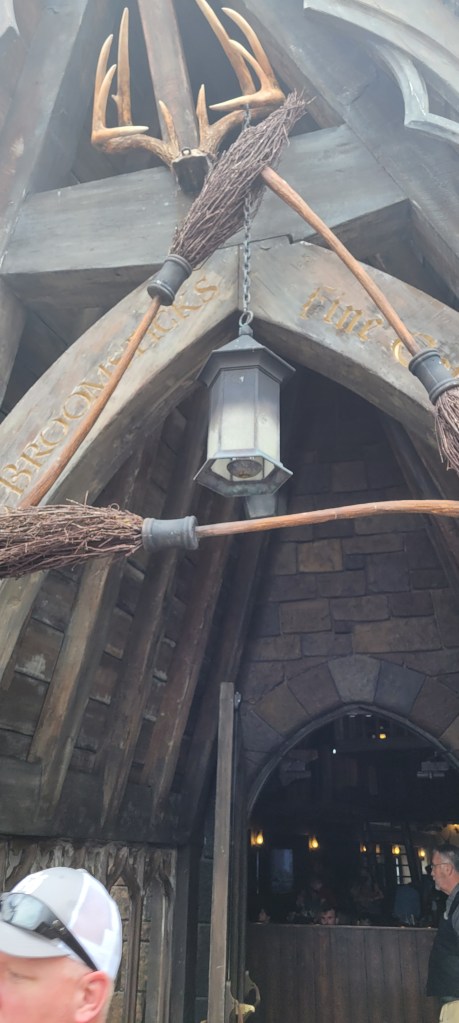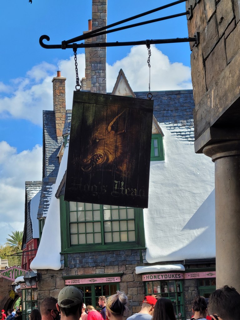Right next door is the Hog’s Head run by Aberforth Dumbledore. This is the place to go if you want to get an alcoholic butterbeer, but unfortunately, you can’t order it that way, you have to get creative. There are several ways to make it alcoholic, I don’t remember all of them, but the one I like the best is a cold butterbeer with a shot of rumchata. You will have to take a couple of drinks of the butterbeer first and then slowly pour the shot into the glass. I have heard that rum and whiskey are also good options to add, but I cannot attest to that.